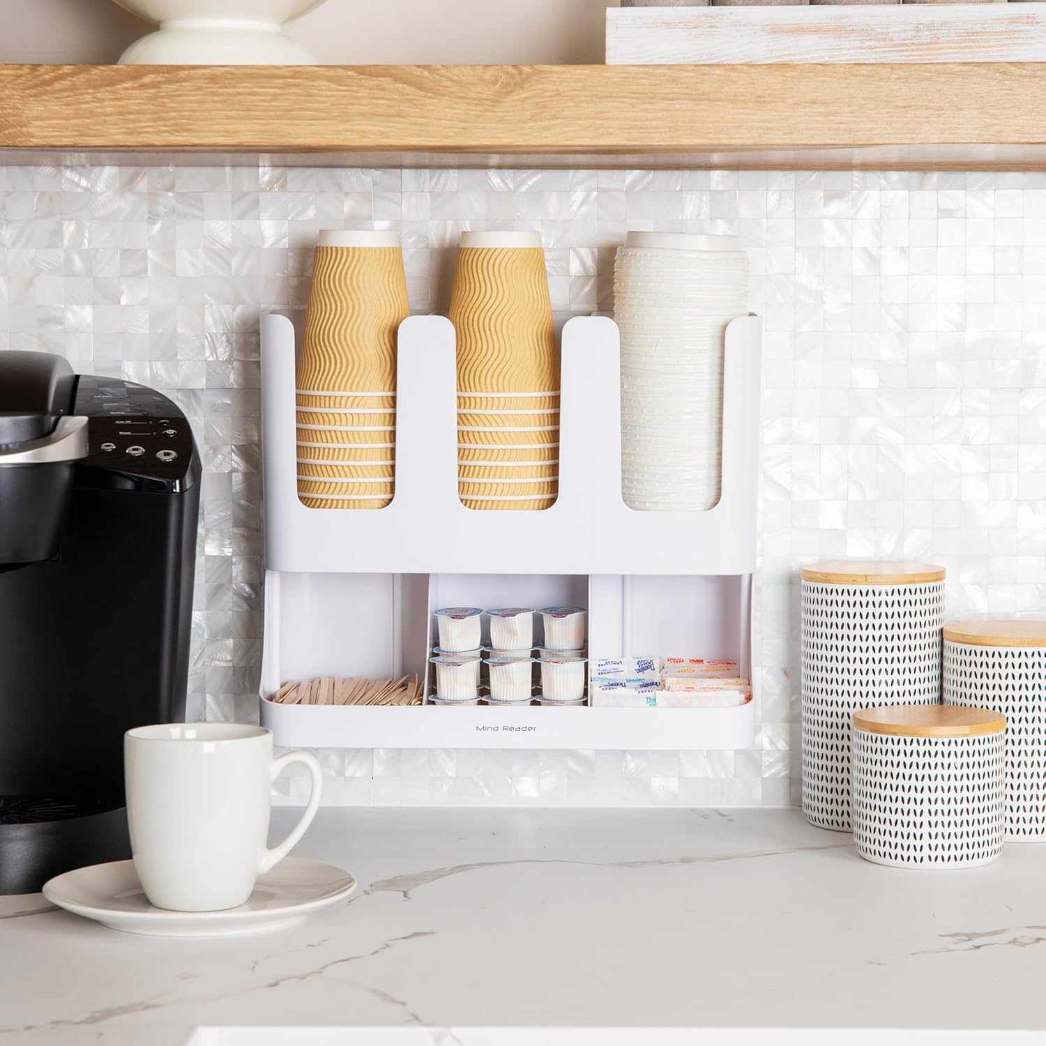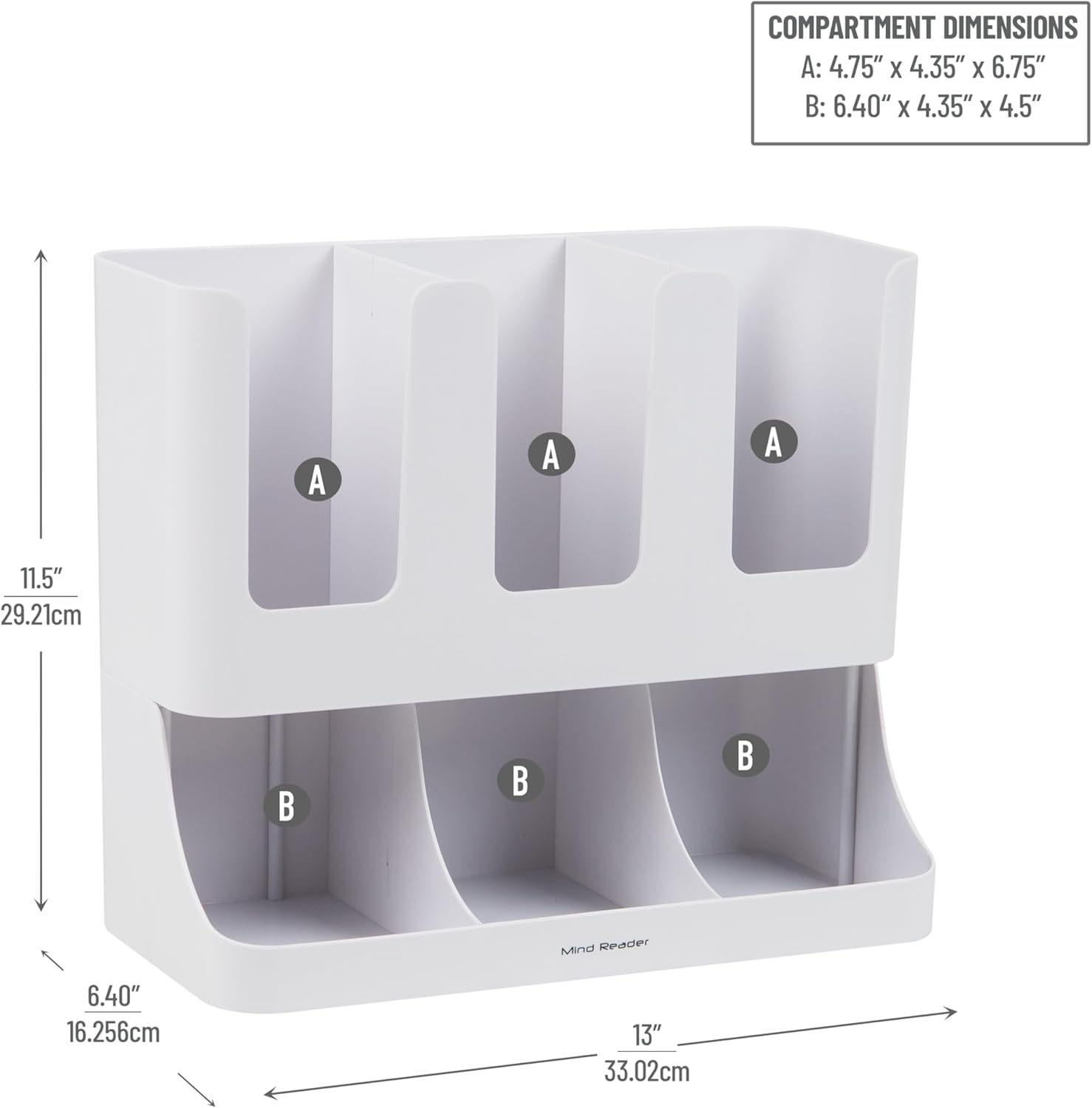 6 compartment upright breakroom coffee condiment and cup storage organizer, white